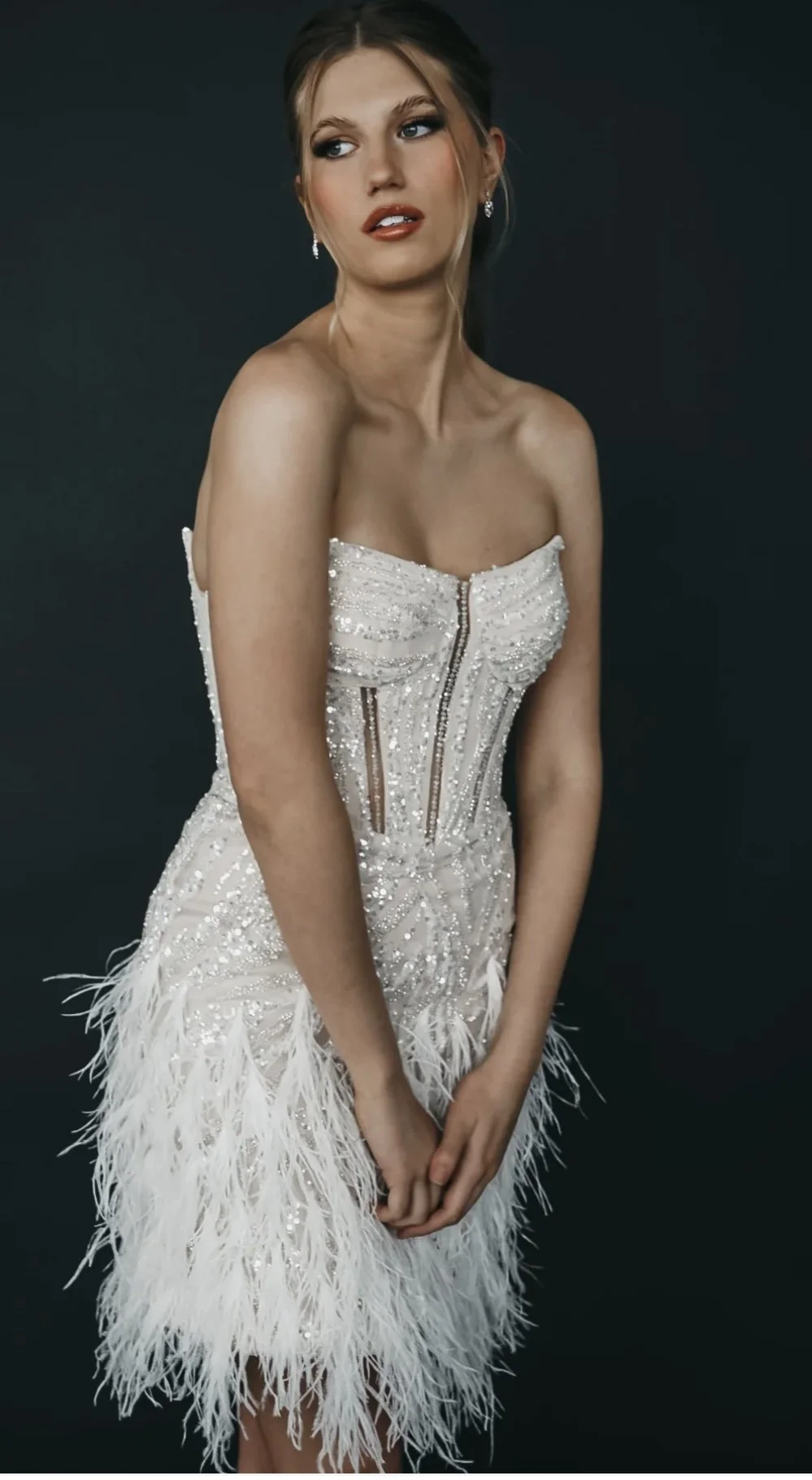 For the bride who loves rich textures and intricate details, the Sophisticated dress lives up to its name. With layers of beaded lace, airy Chantilly, and whimsical feather accents, this mini makes every moment unforgettable.