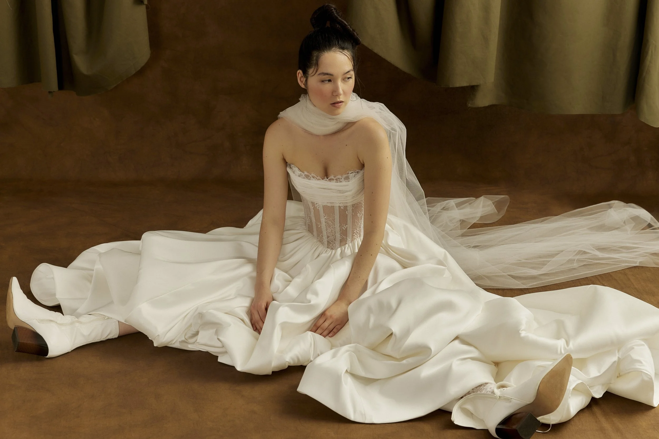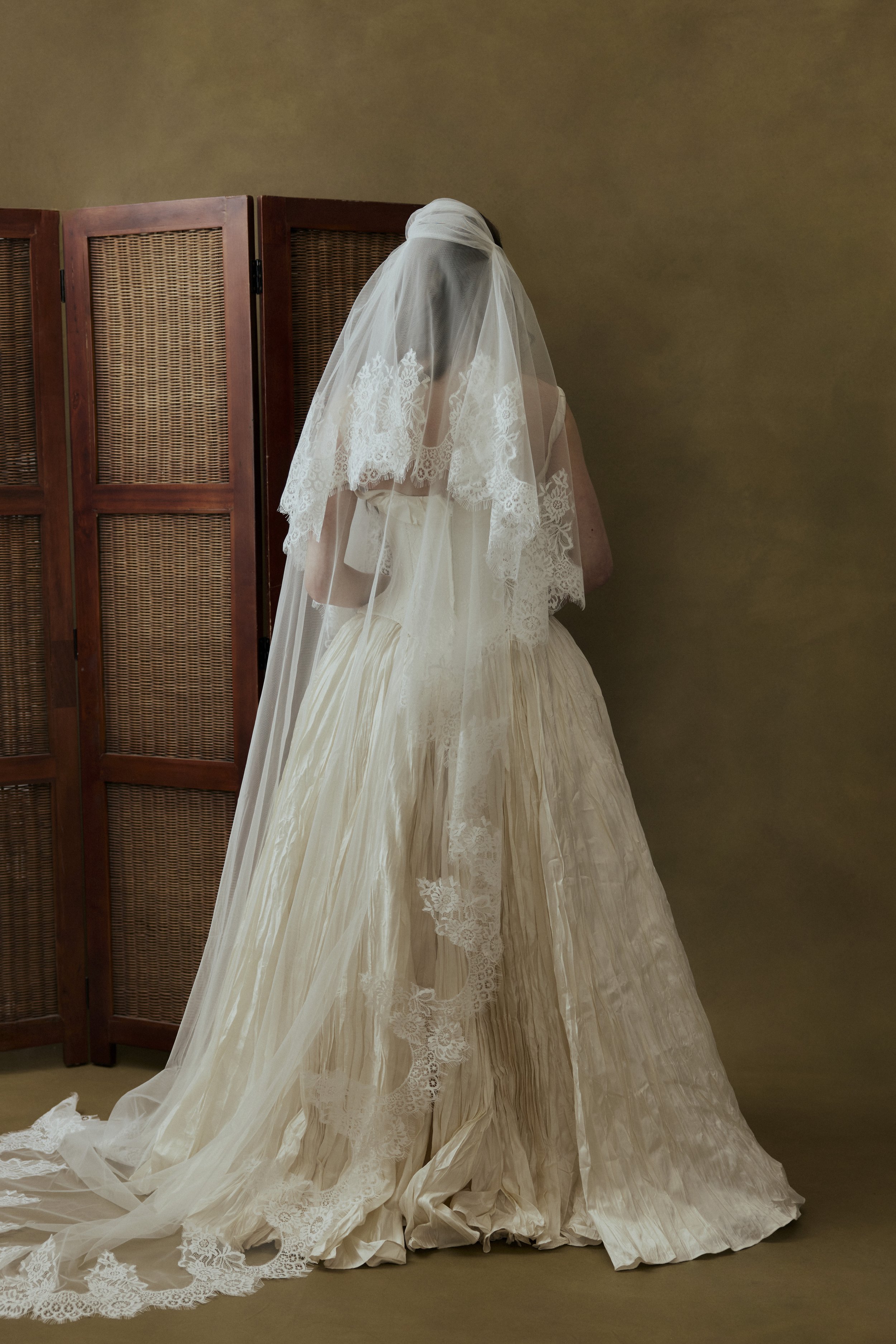 Silks lend a quiet sheen that feels sophisticated in motion, while hand-pleating and carefully selected lace create dimensional texture without heaviness. Fabrics are layered and shaped in a way that balances softness with structure — sculpting a silhouette that feels intentional and expressive without overwhelming the bride’s presence.
